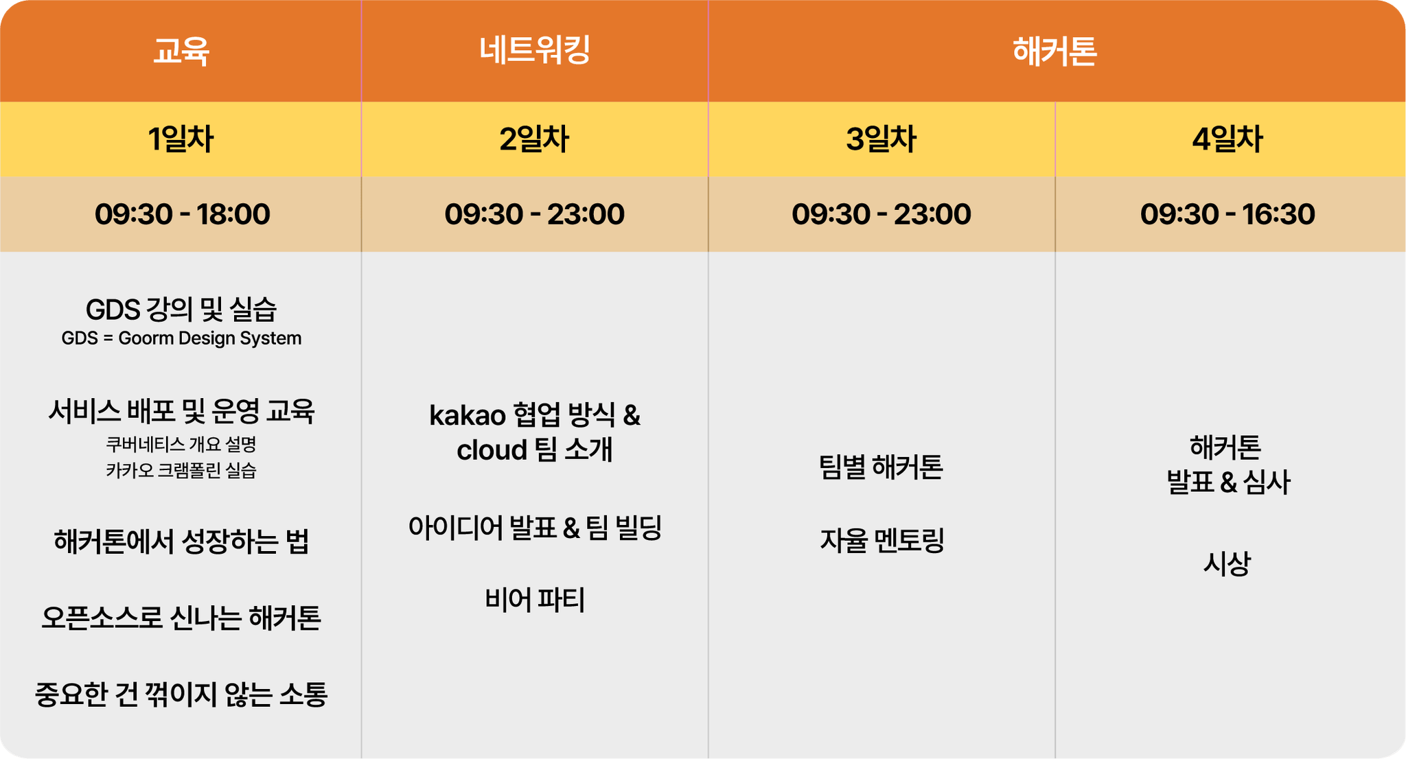 점심시간도 끝나게 되면 바로 일정에 있는 내용대로 강의를 진행합니다. 처음 강의는 GDS 강의 또는 카카오 크램폴린 강의 중 하나를 듣게 되는데, 카카오 크램폴린 강의는 신청자에 한해 들을 수 있습니다. 저는 GDS 강의를 들었는데, 사내에서도 디자인 시스템을 따로 구축했던 경험이 있어서 흥미롭게 들었습니다. GDS가 정리되어 있는 피그마 링크를 받아서 확인했었는데 컴포넌트 종류가 정말 다양한 것을 보고 많은 고민들이 녹여져 있겠다 생각했습니다. 근데 따로 실습은 없었고, 해커톤에서도 활용은 안되었던 것 같아서 아쉬웠습니다... 실제로 사용해보고 싶은 컴포넌트를 가자가 붙여보는 식으로 실습이 있었으면 좋았을 것 같아요.