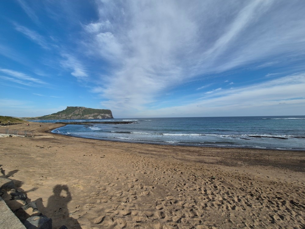 저 앞에 성산일출봉이 맞나..?가 보이는 바다가 절경이었습니다. 바다 위 모래사장에서 말 타고 달리는 모습이 서부를 연상케 하기도 했네요. 기념으로 팀원들이랑 같이 바다를 배경으로 이리 찍고 저리 찍고 ㅋㅋㅋㅋ 재밌었어요.