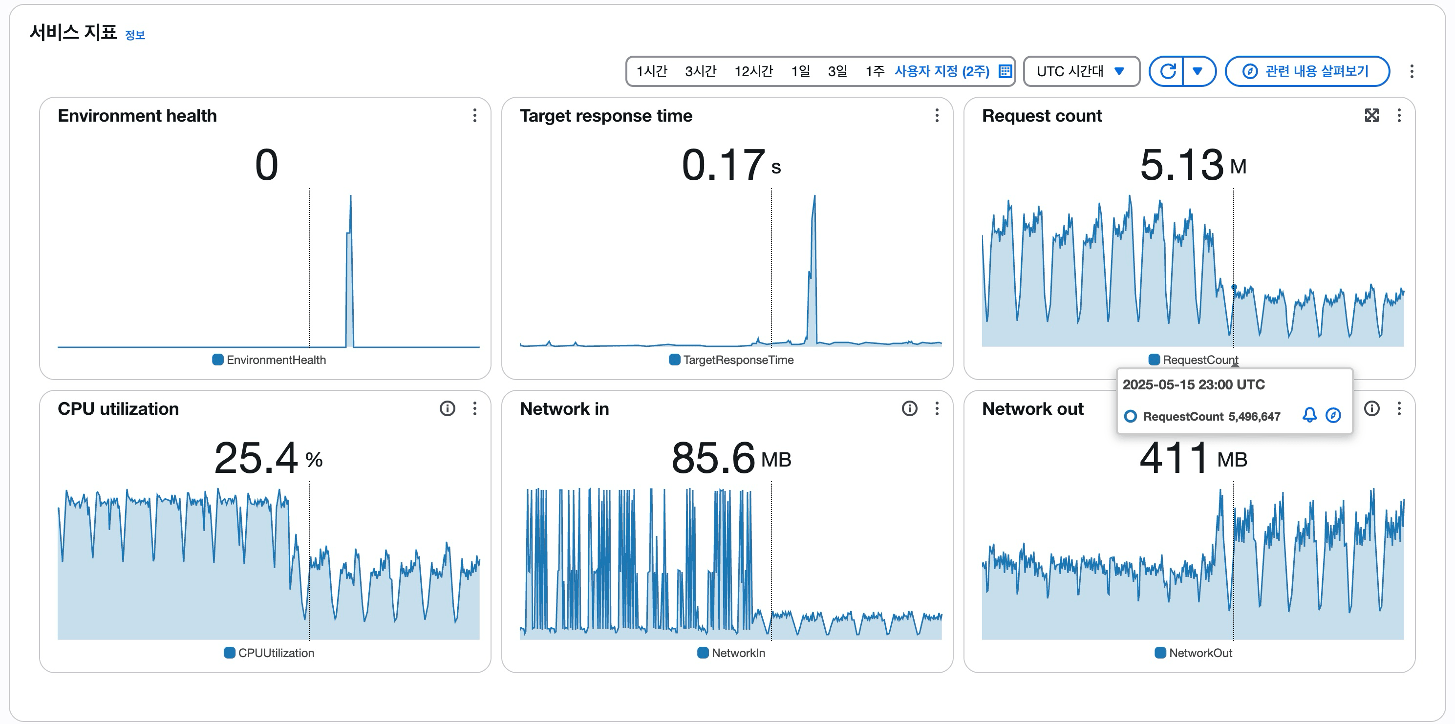 운영 환경에 적용한 지 2주가 지난 후, EB 콘솔 모니터링 결과는 다음과 같습니다: