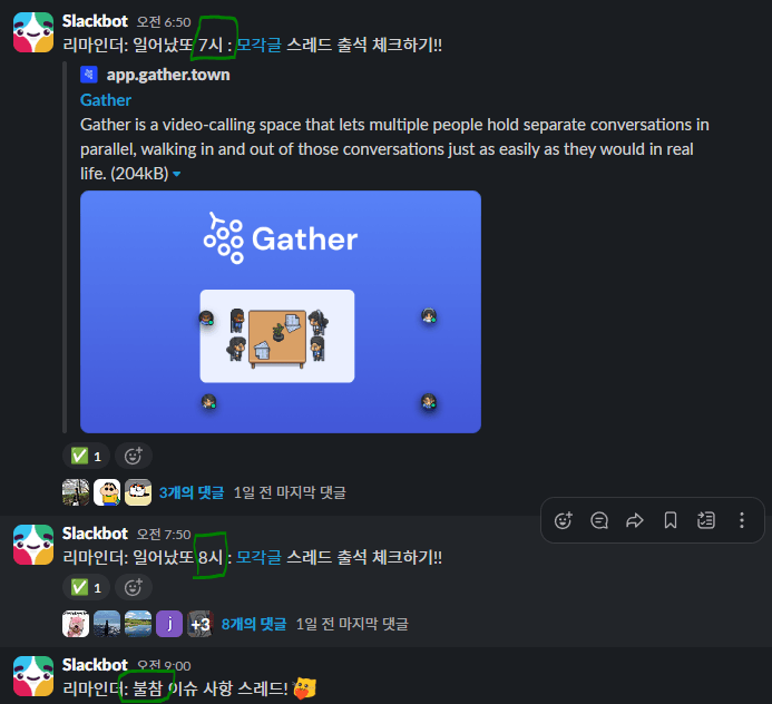 시간이 지날수록 인원이 증원됨에 따라 관리 리소스가 많이 발생하여 모임장님이 이것저것 많이 신경을 쓰셨다. 매일 참여자들의 인증 체크는 기본이고, 하룻밤이 지나기 전에 채널에 항상 격려의 글을 남겨주셨다.