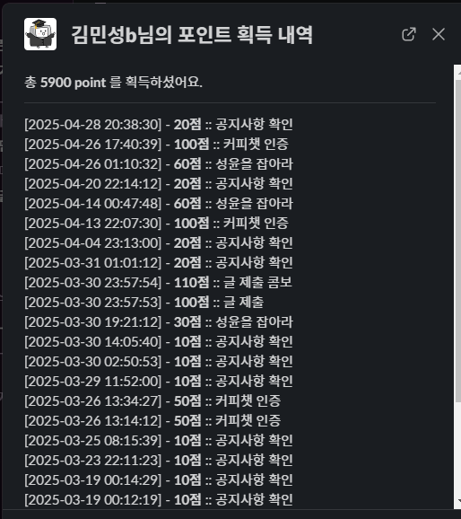 내가 지금까지 얻은 포인트는 이렇다. 회고 글을 나중에 수정하다보니 4월 내역도 포함되어 있는데, 이를 빼면 대략 5500포인트 정도가 된다.