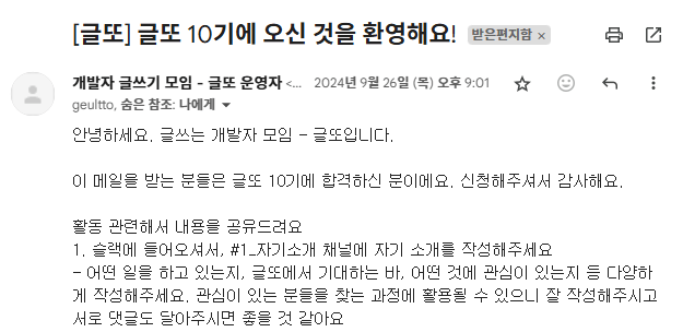 2024년 9월 26일 월요일 오후 9시에 이메일로 합격 알림이 왔다. 기쁜 마음으로 전달받은 슬랙 링크로 접속하고, 글또 10기를 시작하게 되었다.