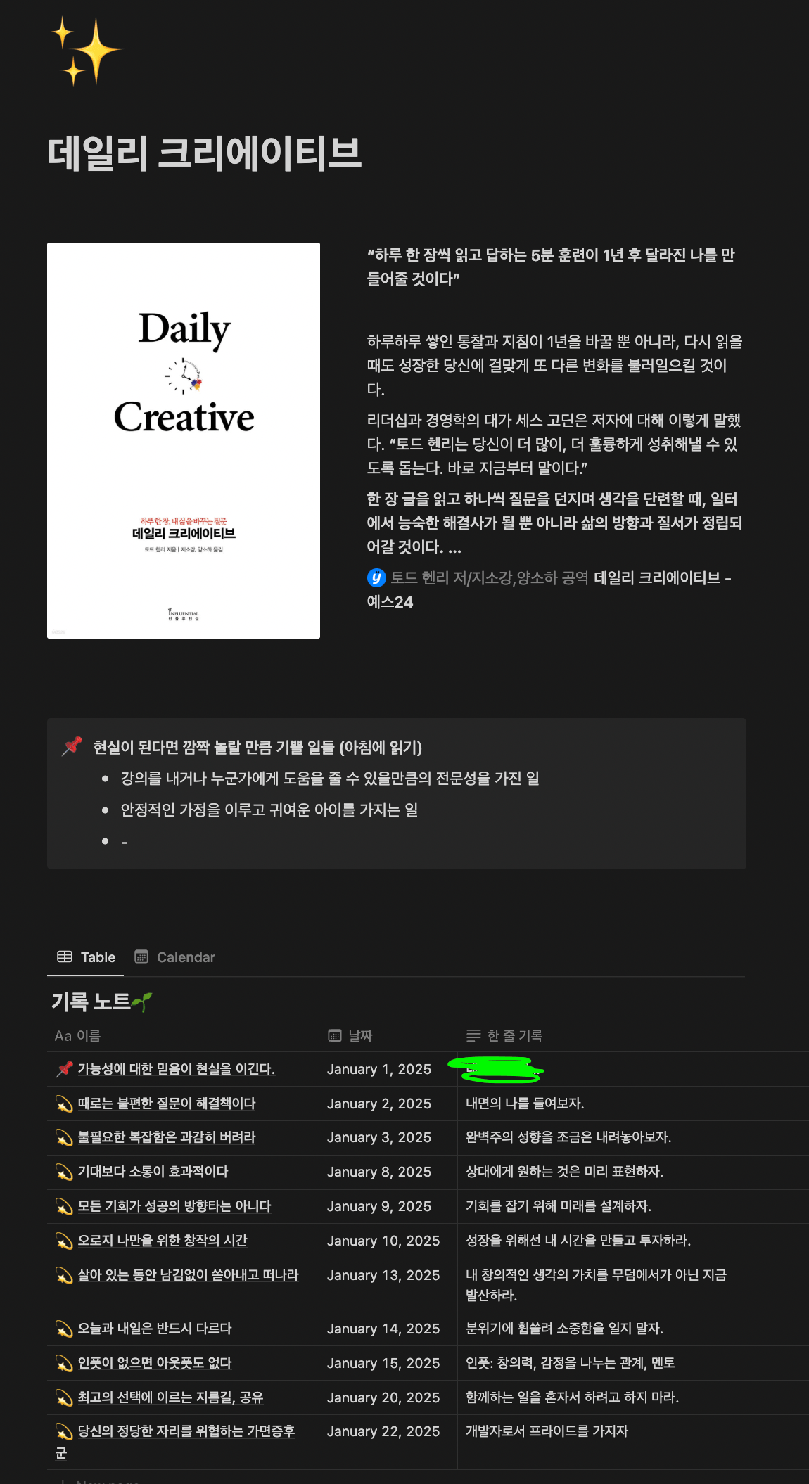 감사하게도 노션 탬플릿을 제공해 주셔서 위와 같이 질문에 대한 답변을 깔끔하게 작성할 수 있었다. 이 소모임은 1월부터 시작했는데, 보다시피 꾸준히 하지 못하고 1월 중도에 놔버렸다.ㅜ