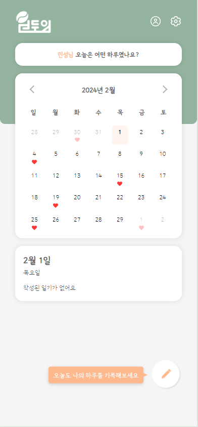 사이드 프로젝트를 해야겠다는 다짐과 함께 지내던 중, 친한 지인으로부터 AI 엔지니어로 직무 변경을 하게 되었다는 소식을 듣고, AI와 관련된 프로젝트를 진행해보면 좋겠다는 생각에 바로 연락을 하고 시작하게 되었습니다. 이 때는 왠지 ChatGPT 정도 수준의 모델을 투입할 수 있을 것이라 생각하며(복선) 지인과 함께 아이디어를 나누었습니다. AI 활용의 큰 기대감과 함께, 무엇을 만들어야 할지에 대한 고민이 시작되었습니다. 그러던 중, 실생활에서 자주 사용하는 일기장에 AI 피드백 기능을 탑재하면 어떨까라는 아이디어가 떠올랐습니다. 그렇게 결정된 프로젝트의 서비스는 '평범한 일기장에 AI 피드백 기능을 탑재한 평범하지 않은 프로그레시브 웹 서비스'였습니다.