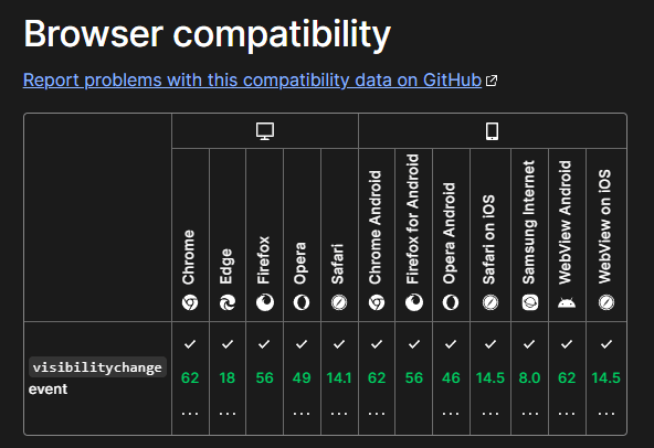 웹뷰의 포커스 감지를 해야 하는 일감을 회의에서 전달받자마자, “아, visibilitychange 웹 API를 사용하면 되겠네!”라고 말했더니 실장님이 하시는 말씀이 “그거 쓰면 안 돼. 구버전 브라우저는 지원되지 않는 기능이야.”였습니다. 아차 싶었던 저는 바로 MDN에서 해당 이벤트의 버전 호환성을 체크했습니다.