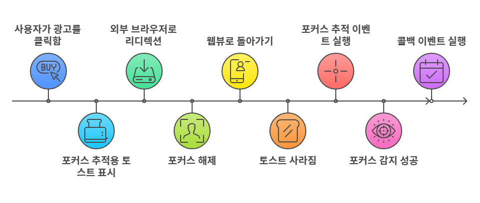 포커스 감지가 필요한 시점에 포커스 추적용 토스트를 노출하고, 외부 브라우저 랜딩으로 포커스를 잃었다가 다시 웹뷰로 돌아오는 타이밍에 토스트가 비노출 처리되기 때문에 이 시점을 체크하기만 하면 됩니다.