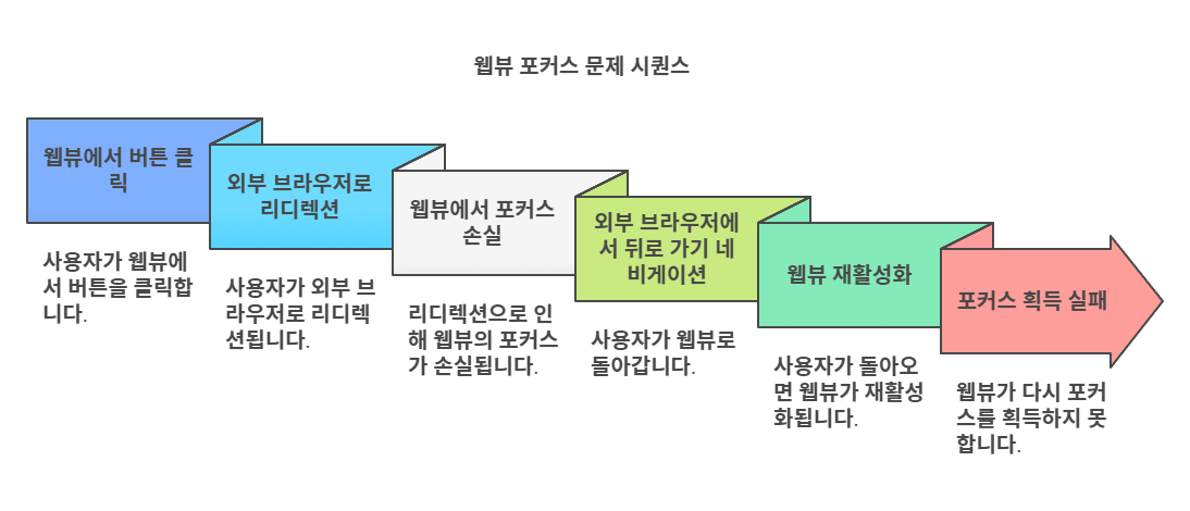 웹뷰 밖으로 나갔다가 다시 돌아와서 한 번의 터치를 해줘야 focus가 잡히고 있습니다. 이처럼 한 번의 터치가 있어야만 focus가 잡히는 것으로는 문제를 해결할 수 없기에 또 다른 해결 방법을 찾기로 했습니다.