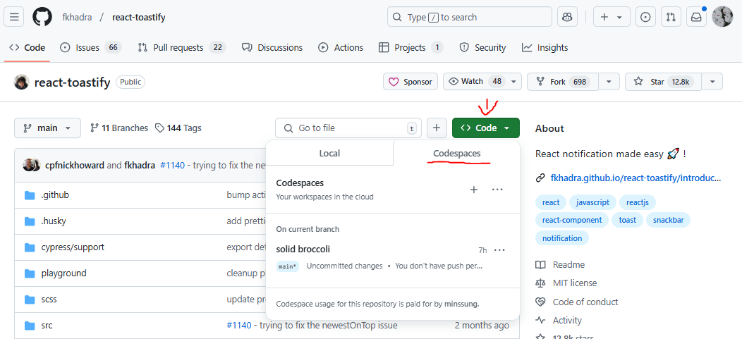 npm link를 통해 프로젝트에서 사용 중인 react-toastify 대신, 코드 스페이스로 가져온 소스에서 코드를 수정하여 테스트할 수 있었습니다. 그나저나 소스 내부를 확인해 보니 역시.. 이해가 쉽지 않습니다.
