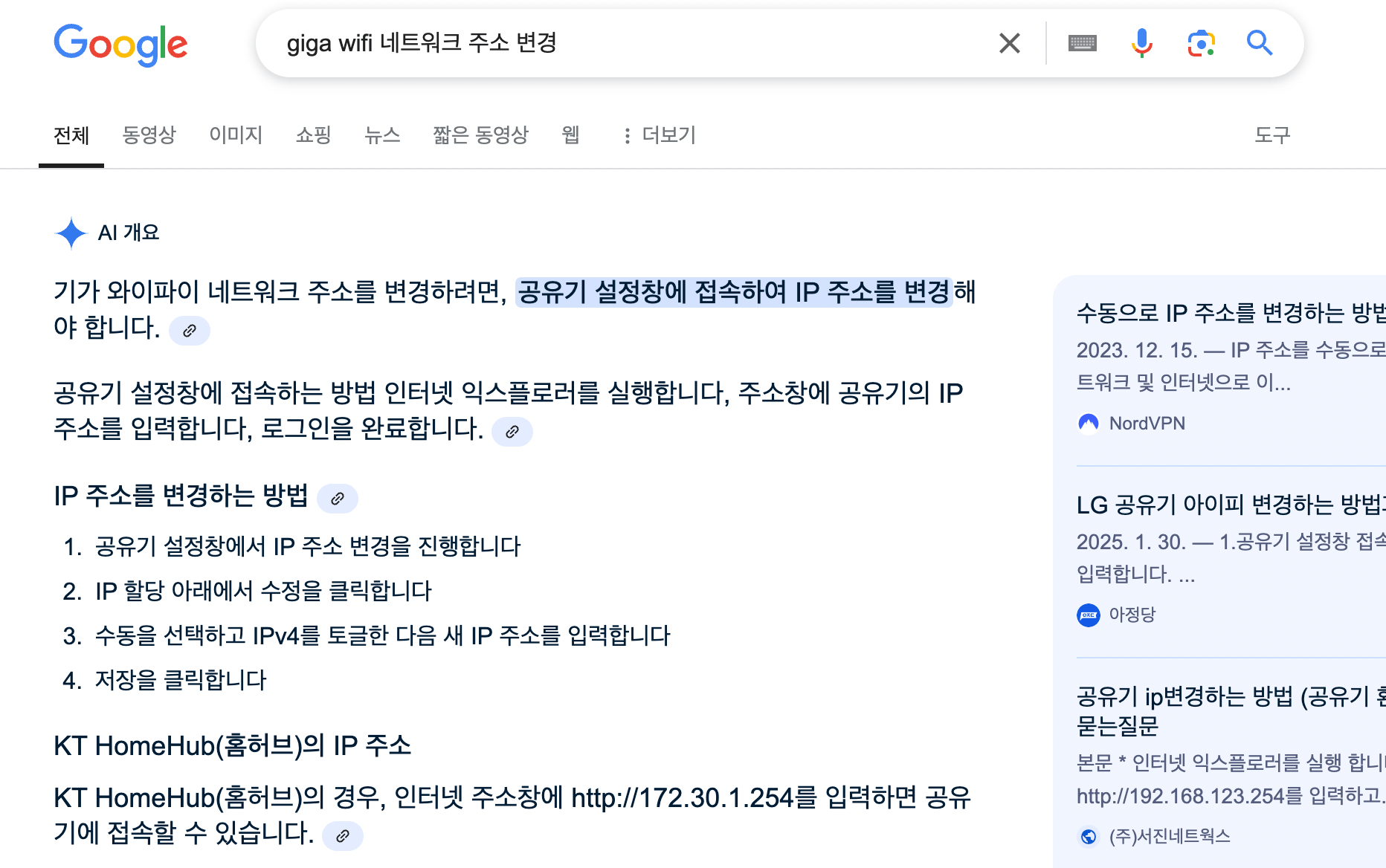 만약, 네트워크 주소가 회사와 집이 서로 다르다면... (회사는 192.168.0인데 집은 172.xx.x) 저도 이랬습니다! 이럴 때는 집의 라우터 주소를 웹 URL에 입력하여 들어가 네트워크 주소를 변경해야 합니다.